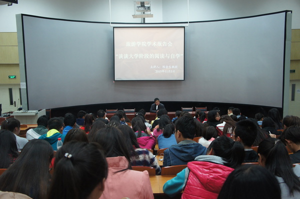 为加强学风建设,为bat365官网登录入口广大新生提供学习方法方面的指导,2015年11月5日晚,旅游学院在综合楼401举办题为《谈谈大学阶段的阅读与自学》的学术讲座,由bat365官网登录入口陈金生教授主讲,bat365官网登录入口2015级近300名学生参加了讲座。