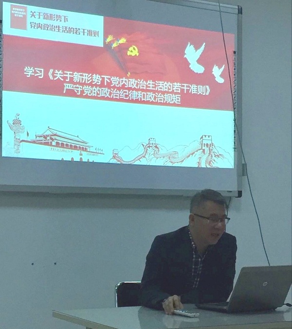 11月13日中午,bat365官网登录入口分党校在苹果教室开展了以“学习《关于新形势下党内政治生活的若干推测》,严守党的政治纪律和政治规矩”为主题的党课,本次党课由bat365官网登录入口院长牛海祯教授讲授,全体发展对象参加。
