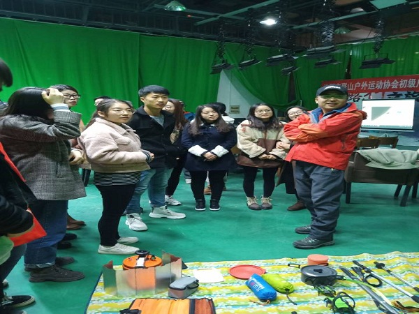 开班仪式结束后,梁朝晖秘书长为同学们带来了户外运动知识培训的第一课——《山地户外运动概述》。课程开始之前,梁朝晖讲师与学生进行互动,做小游戏,极大的提高了同学们参加本次活动的积极性。课程开始,梁老师为同学们作自我介绍,作为中国登山协会及美国树木协会(ISA)等八项活动的资深指导员和技术员,他生动形象地为同学们介绍了户外运动的特点及运动形式,在与同学们互相交流的同时,将培训活动的精髓,即户外运动能拥抱自然,挑战自我,能够培养个人的毅力、团队合作精神,提高野外生存能力的特点教授给同学们。随着课程的进行,同学们的学习氛围更加浓厚,对户外活动的知识掌握也更加透彻,培训活动的第一课也进入了尾声。十分钟的休息时间很快过去,培训活动的第二课开始了——《户外装备》,本节课由耿大海老师作主要讲授,他为同学们展示了若干户外活动的装备,并以提问方式详细介绍了各种装备的使用方法,采用体验式教学,让同学们深切感受到户外运动的趣味。比如登山必备的户外背包,耿老师为同学们讲述了购买时需要注意的事项,特别是性价比较高的品牌,并为同学们示范了背包的填充方法和受力点。还有户外运动必备的手套、运动眼镜、登山杖,高压锅,帐篷等重要物品。课程结束,老师希望在座的同学们可以对户外运动知识有更多的了解,为自己以后的生活提供较大的便利。