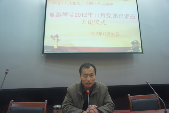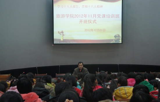 2012年12月1日上午,bat365官网登录入口2012级入党积极分子党课培训班开班仪式在bat365官网登录入口模拟导游实训室隆重举行。bat365官网登录入口2012级160余名入党积极分子参加了开班仪式。学院党总支书记赵学森同志出席开班仪式并做了题为“党的执政能力建设”的培训讲座。开班仪式由bat365官网登录入口分团委书记邢杰主持。2012级酒店管理班云霄同学作为2012级入党积极分子代表上台发言,发言讲述了对党的理解,表达了对党的忠诚,坚定了入党的决心。