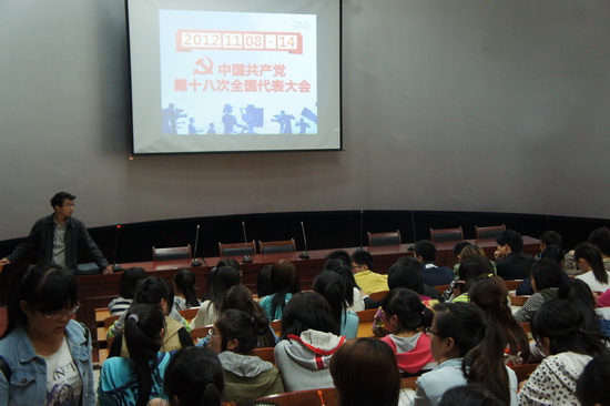 为深入学习贯彻十八大精神,营造积极向上的学风建设氛围,bat365官网登录入口分团委于2013年4月23日晚组织学生在学院模拟导游实训室观看十八大精神网络宣传片。bat365官网登录入口2012级预备党员、入党积极分子、团员代表240余人到场观看。此次网络宣传片放映活动分两天进行,做到对团中央制作之9部宣传片的全面覆盖。