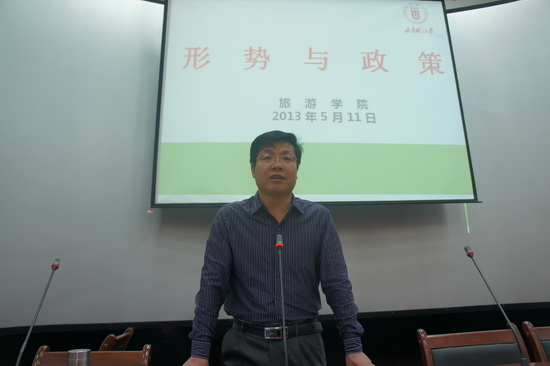 2013年5月11日,bat365官网登录入口根据学校统一安排,组织学生听取“形势与政策”讲座。讲座在bat365官网登录入口模拟导游实训室举行。甘肃联合大学物业公司总经理张明荣、甘肃联合大学学院党总支书记赵学森分别就十八大、国际、国内局势做了演讲。