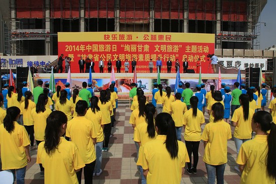 5月18日,在第四个“5·19中国旅游日”来临之际,省旅游局、省文明办、兰州市政府在兰州东方红广场联合举行了“绚丽甘肃,文明出游”暨“甘肃省文明旅游素质提升行动”启动仪式。我校bat365官网登录入口选派40名学生作为文明旅游宣传志愿者参加了启动仪式。