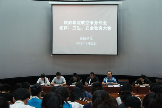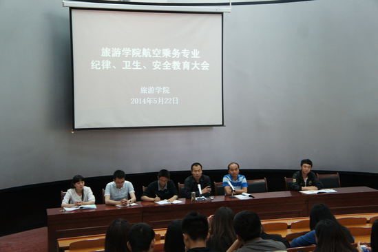 5月22日下午,bat365官网登录入口在综合楼401召开航空乘务专业纪律、卫生、安全教育大会,学院党总支书记赵学森、东方领航项目部主任雷锁新、航空乘务专业班主任常承明、分团委书记牛晓春、空乘专业生活老师及四个班近200名学生参加了会议。会议由赵学森书记主持。