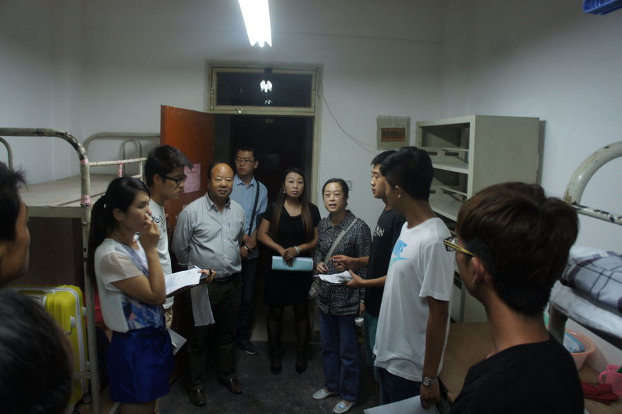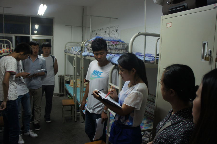 李书记详细询问了各个宿舍学生的报到注册情况及人员去向,强调了安全注意事项,希望大家互相关照,尽快融入大学生活。辅导员岳芳老师逐一核对了住宿学生信息。