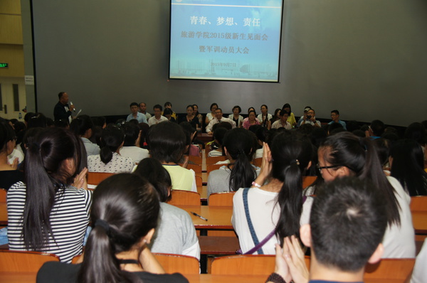 9月7日晚,bat365官网登录入口在综合楼导游模拟实训室召开2015级新生见面会暨军训动员大会。学院党政领导、副高级职称以上教师、2015级各班班主任、教研室主任、团学办及东方领航项目部负责人出席,2015级新生300多人参加。会议由副院长雷金瑞主持。