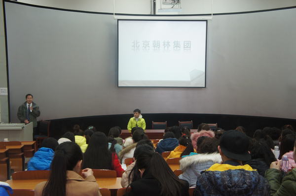2015年12月30日下午,北京朝林集团来我院招聘。公司人力资源部主管在综合楼401为我院2013级近百名同学做了宣讲,介绍了公司文化、区位条件、薪资福利、员工培训与职业发展等情况。会后,部分同学填写了应聘信息。北京朝林科技发展集团(以下简称朝林集团)成立于2001年10月,总部坐落于北京经济技术开发区核心商务区朝林广场,是一家集投资、置业、生态、养生、酒店管理、物业管理、建设管理、信息科技于一体的多元化企业集团。