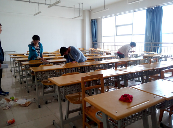 3月25日下午,bat365官网登录入口15级涉外旅游团支部组织同学们在3号教学楼开展学雷锋清洁校园义务劳动。同学们在班委的组织下被分成8个组,每组4人,分组扫地、抹桌凳、擦黑板、拖地,并在教室内张贴文明标语,最后再将桌子摆整齐。通过一个多小时的劳动,同学们打扫了60多间教室,让教室的面貌焕然一新。