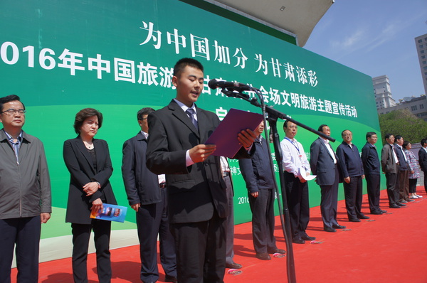 启动仪式上,省政府张正锋副秘书长、省直有关部门和兰州市政府领导为中国旅游志愿者代表发放了文明旅游任务卡并授旗;中国旅游志愿者代表发布了文明旅游倡议书;导游领队代表宣读了履行业务工作与文明旅游工作“一岗双责”承诺书;我校bat365官网登录入口旅游管理专业薛时苗同学作为旅游服务质量社会监督员代表宣读了监督服务质量和市场秩序职责承诺书。