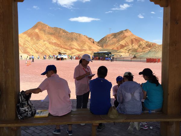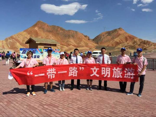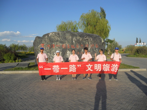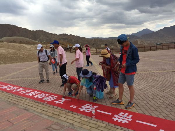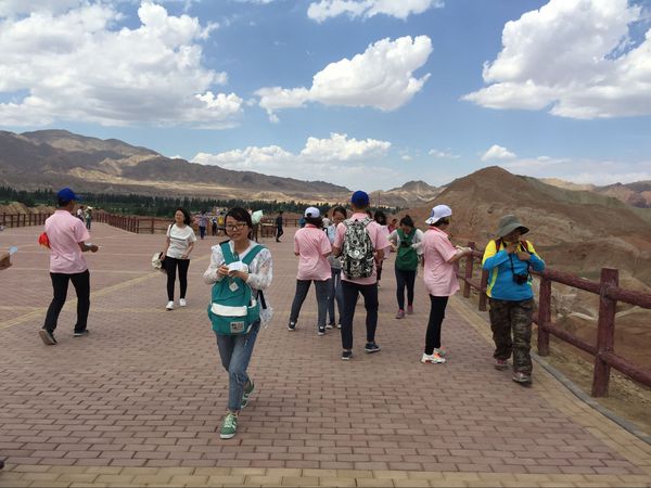 中午12点,队员们到达了活动第二站——张掖市国家丹霞地质公园。尽管调研受到了阵雨天气的影响,但队员们还是在游客们的积极配合下,顺利完成了“一带一路文明旅游”的问卷调研、签名及文明旅游提示宣传活动。队员们还巧遇了同样来丹霞地质公园做志愿服务的河西学院暑期社会实践团队,彼此交流了实践活动开展的经验与心得。在这里,队员们感受到了游客们的热情和七彩丹霞的壮丽!