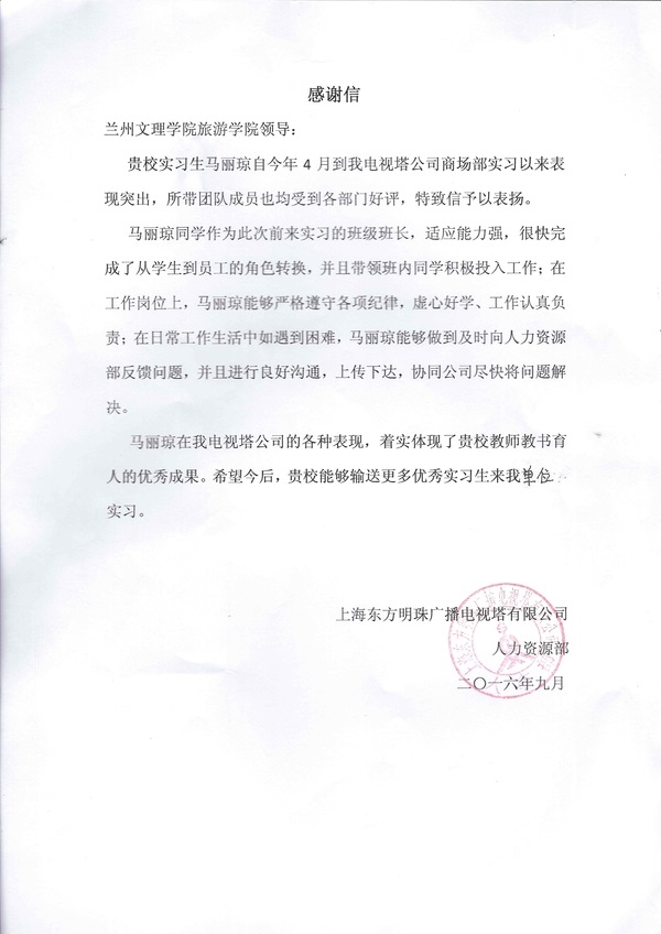 近日,bat365官网登录入口收到来自上海东方明珠广播电视塔有限公司的感谢信,信中对以马丽琼同学为代表的bat365官网登录入口14级景区开发与管理专业15名实习生表示高度赞赏。