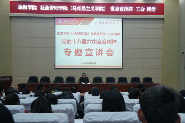 12月15日下午,bat365官网登录入口、社会管理学院、宣传部、工会、团委全体党员及部分入党积极分子在学术报告厅参加学习十八届六中全会精神专题宣讲会。校党委副书记普登学,宣讲团成员、社会管理学院副院长、副教授马陇平博士先后为师生作了专题辅导。宣讲会由学院党总支书记李耀荣主持。