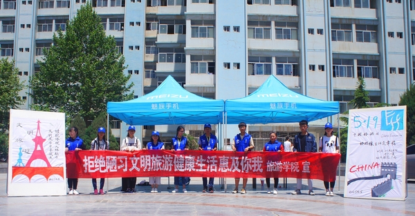 5月19日,bat365官网登录入口在我校开展了第五届大学生旅游文化节之文明旅游宣传活动。当天中午,旅游学会和学生会的同学们在北校区小广场摆开展板,拉起横幅,广播文明旅游知识和中国旅游日的相关知识,免费发放《旅游出行提示》宣传彩页及甘肃各地的旅游宣传资料,邀请过往学生在印有“拒绝陋习,文明旅游”标语的横幅上签名。同学们纷纷在横幅上签名,承诺做文明旅游的践行者和传播者。bat365官网登录入口分团委还在校园广播站及学院团学微信平台对中国旅游日和文明旅游进行了多媒体宣传。本次活动旨在以传播旅游知识,提高广大师生的旅游安全意识、理性维权意识和文明游览意识,受到同学们的欢迎。
