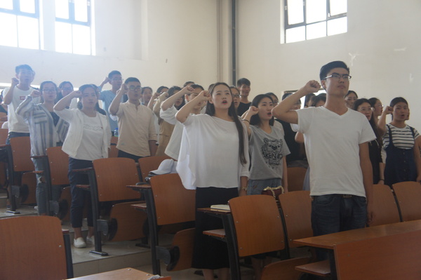 仪式在慷慨激昂的国际歌声中拉开帷幕,在领誓人王金东同学的带领下, 全体预备党员面向鲜红的党旗,举起右拳庄严宣誓。参加宣誓的预备党员代表王金东同学发表了感言,向党组织承诺努力做一名合格的共产党员。