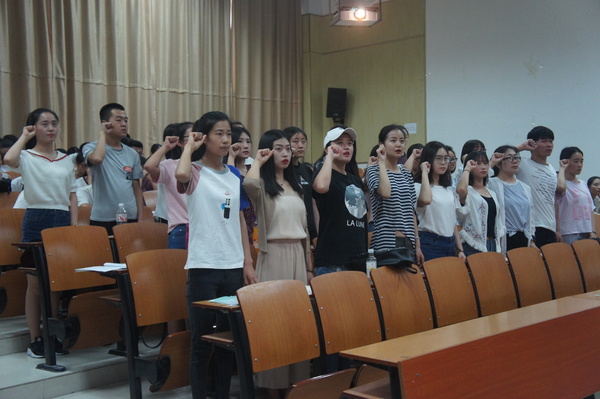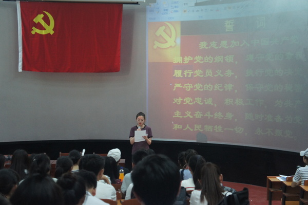 为纪念建党96周年,持续深入推进“两学一做”学习教育常态化制度化, 6月30日中午,bat365官网登录入口学生党支部在综合楼401教室隆重举行预备党员入党宣誓仪式暨总支书记讲党课活动。学院党总支书记李耀荣、学生党支部书记彭兰玲和牛晓春、党员及入党积极分子参加了活动。