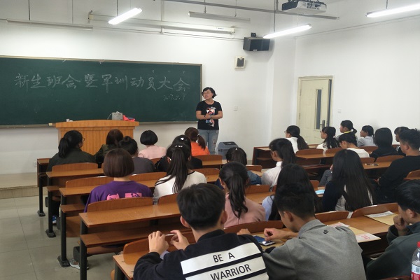 会上,各班班主任都代表学院欢迎每一位步入大学校园的同学,并向同学们介绍了本专业的基本情况,学习方法及将来的就业方向,强调了学校的各项规范制度,同学们也表达了自己对未来四年大学生活的规划与向往。此次班会,在非常活跃的气氛下进行,各班班主任从军训的必要性入手,向大家阐述了上好大学第一课的重要意义。他们说:“学生军训是全民国防教育的重要组成部分,也是学校开展国防教育、培养高素质人才的重要形式。其重要意义在于促进学生德、智、体、美全面发展,树立正确的人生观、世界观、价值观,有利于培养社会主义建设事业的‘四有’新人,更好的践行社会主义核心价值观;有利于激发学生爱国卫国意识,增强‘国无防不立,无兵不安’的观念,提高全民族的国防意识。”一番慷慨激昂的话语顿时点燃了同学们对军训的热情。最后,各班班主任通过自荐、推荐等方式,选举出班长、团支部书记等班委成员,各班委成员都表达了自己愿意为班级服务的决心,新生见面会暨军训动员大会圆满结束。