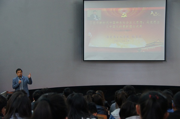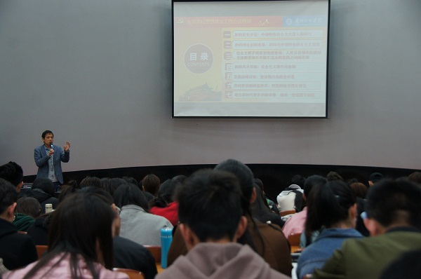 首先,张教授指出,作为当代大学生,不仅要关心国家大事、国际新闻,还要关注国际形势。十八大以来,国内外形势变化和我国各项事业的发展都提出了一个重大时代课题,围绕这个重大时代课题,形成了新时代中国特色社会主义思想。在十九届一中全会上再次当选中共中央总书记的习近平,在中外记者见面会上,用最精炼的语言,对中国未来的五年做出了令人激动的描绘。习近平总书记强调,未来五年是极其重要的五年,2018年是中国改革开放40周年,2019年是中华人民共和国成立70周年,2020年是全面建成小康社会之年,2021年是中国共产党成立100周年。从中共十九大到二十大的五年,我国正处在实现“两个一百年”奋斗目标的历史交汇期,第一个百年目标要实现,第二个百年目标要开篇。最后,张教授阐述了我国社会主要矛盾是人民日益增长的美好生活需要和不平衡不充分的发展之间的矛盾,希望同学们时刻适应新时代的各种变化,充分利用互联网,认真学习党章党规、《习近平新时代中国特色社会主义思想》等理论,奋力走好新时代的长征路。