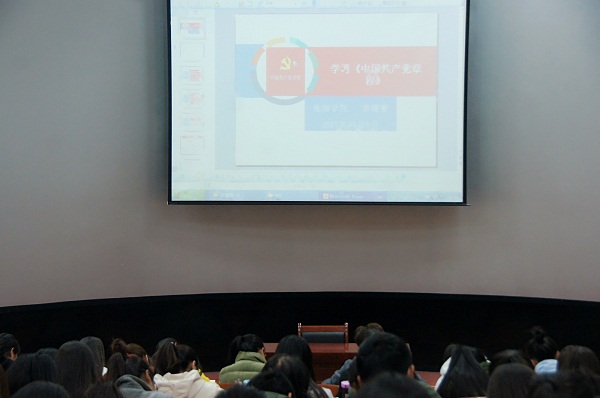 根据学校党委组织部《关于整合2017年入党积极分子和发展对象培训工作的通知》和全面从严治党的要求,以及发展党员有关规定,2017年11月17日晚,来自bat365官网登录入口、社会管理学院、外语学院、社会体育学院的74名发展对象在5-401导游模拟实训室学习了《中国共产党章程》,本次培训课程由学院党总支书记李耀荣主讲。