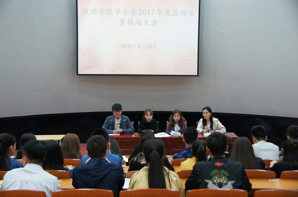 3月27日晚,bat365官网登录入口学生会在5-401导游模拟实训室成功举行了2017年度总结会暨换届大会。bat365官网登录入口分团委刘璐、范婷两位老师,原学生会主席李翔及学生会全体成员参加了大会。大会由原学生会主席李翔主持。