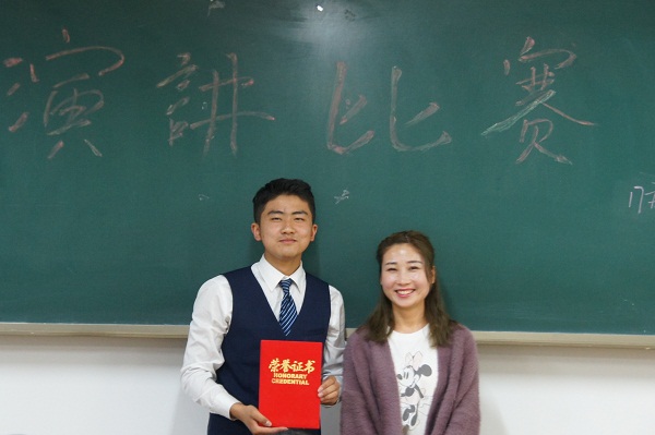 19名参赛选手精神饱满、感情充沛、表达流畅,他们富有感染力的演讲打动了在场观众,迎来全场的热烈掌声。《崇洋媚外》《规划》《厉害了我的国》《鹤魂》《远行的孩子》《如果有那么一个黄昏》《当你老了的时候》《父母是世界上最大的备胎》等选题贴近大学生活,弘扬青春正能量。一段段文辞优美的叙述和观点独到的见解,引起了观众的强烈共鸣,现场掌声不断,各位选手通过演讲展现了自己高超的语言表达能力和各具特色的人格魅力。经过激烈角逐,王誉臻同学荣获一等奖,梁真、吴国文、南希胜三名同学获得二等奖,吴卓妍、李涛、杨彬等5名同学获得三等奖,陈露露、王洁、何鑫等10名同学获得优秀奖。范婷和任静两位老师分别为获奖选手颁奖并合影留念。