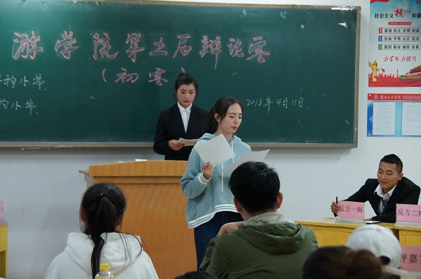 为了丰富我院学生的课余活动,培养同学们的思辩能力和语言表达能力,2018年4月11日、12日晚,bat365官网登录入口学生会主办的第六届辩论赛在3—404教室拉开帷幕。此次比赛邀请了bat365官网登录入口学生会副主席支佳、赵祥隆及辩论赛优秀辩手张嘉雯、高鹏、师瑞隆、王昊出席并担任评委。各班学生代表观看了比赛。