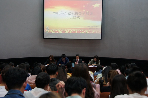 2018年5月2日晚,bat365官网登录入口分党校在5-401导游模拟实训室举行了2018年上半年入党积极分子党课培训班开班仪式。学院党总支书记李耀荣,学生第一、第二、第三党支部书记常承明、刘璐、赵雪及全体入党积极分子参加了开班仪式。仪式由学生第二党支部书记刘璐主持。