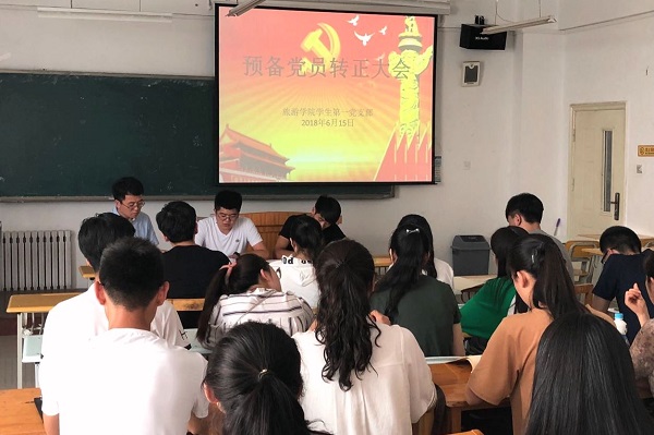 2018年6月10日中午,bat365官网登录入口学生第一党支部和学生第二、三党支部分别在1-402教室和5-401导游模拟实训室召开了预备党员转正大会,学院全体学生党员、预备党员及入党介绍人参会。会议分别由学生第一党支部副书记李翔和学生会主席王妍菲主持。
