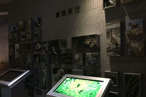 走进张掖城市湿地博物馆,据工作人员介绍,该馆是集收藏、研究、展示、宣教、科普于一体的湿地生态博物馆和城市主题展示馆。它凸显了黑河湿地国家级自然保护区的战略地位、地质地貌、自然资源、环境演变及生态保护成就,构成了室内与室外、实景与虚景、历史与现代相结合的湿地生态科普科研基地。通过采访,有一位北京游客说道“张掖湿地之行,颠覆了我对张掖的原有印象,想象中的河西走廊干旱少雨、风沙漫天、戈壁沙漠广布,没想到张掖的绿洲这么美丽,天蓝、地绿、空气清新、芦苇连片、水鸟成群。更没想到张掖竟然有这样一座环境优美、布展内容丰富、陈展手段先进的以生态为主题的现代化博物馆。”