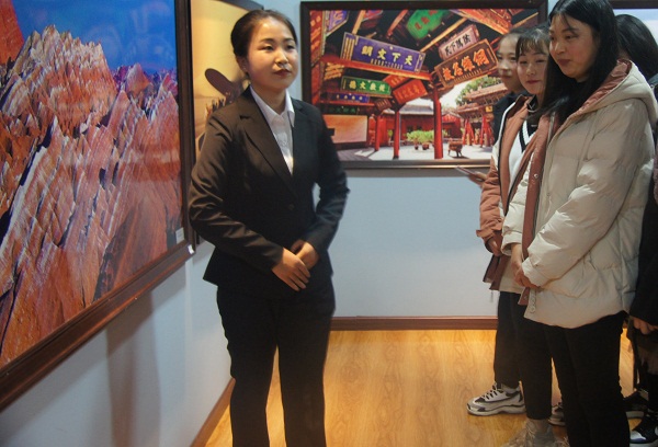 走进多彩的摄影展展厅,热情并具有专业素养的讲解员通过对摄影作品的讲解带我们领略了甘肃文化不一样的风采。如世界上最大的艺术宝库——莫高窟,以精美的壁画和彩塑闻名遐迩;从画面中可以看到莫高窟的标志性建筑——九间楼,仿佛让我们看到了敦煌文化瑰宝的色彩;山以灵而故鸣,水以神而益秀,鸣沙山与月牙泉相伴为邻,构成自然奇景,真可谓“鸣沙山怡性,月牙泉洗心”。兰州刻葫芦是中国至世界上独一无二的汉族民间技艺,主要用刀或者针在葫芦表面进行阴刻,来体现中国传统绘画山水、花鸟、人物和书法,刻葫芦和兰州牛肉面、羊皮筏子并称兰州三宝。坊间有“吉祥葫芦牛肉面,羊皮筏子赛军舰”的说法。每一部作品都有独特的风格,各自的韵味,一个个精彩的瞬间,在镜头,更在心意间。这些使人记忆犹新的作品是对伟大祖国壮丽河山的赞美,也是对中华民族辉煌成就的展示。