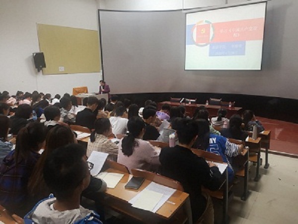 开班仪式结束后,李书记为学员讲授了第一课——学习《中国共产党章程》。《中国共产党章程》是党的最高法则,是一切活动的最根本的章程。李耀荣书记为同学们系统地解读了党章的内容及发展历程,通过大量的史料,让同学们明白了党章修订的历史背景,对为什么要学习党章有了一个更深刻的认识。从生活和学习出发,使同学们了解了学习《党章》的重要性。最后,李耀荣书记对同学们的学习方面和生活方面做出了要求,不论做什么事都要有明确的目标,以党员的标准严格要求自己。