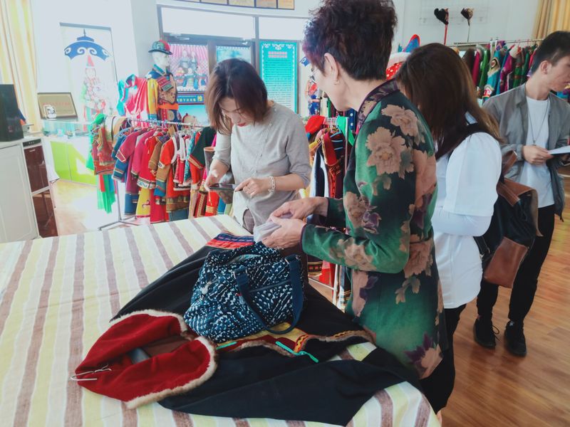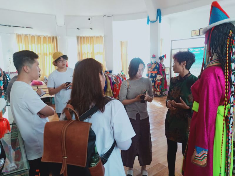 725日上午,调研团再次来到了娜仁其其格老师的蒙古族服饰展厅,与娜仁老师和萨尔娜老师进行了深入的访谈和问卷调查,充分了解到蒙古族服饰的文化传承和保护现状。随后,我们跟随老师来到娜仁蒙古服饰有限责任公司,对于肃北蒙古族服饰的相关资料进行了了解和掌握。娜仁老师还给我们介绍了蒙古族服饰保护和传承的现状。她表示对于蒙古服饰的制作,在一定程度的改良下,更要准确的了解非遗文化,且保留其原有的特色和精髓。当地政府也将每周三定为“肃北蒙古族服饰日”,规定每逢周三,必须穿着蒙古族服饰。这一切的变化,对于娜仁其其格来说,是蒙古族服饰文化的回归的一种表现。