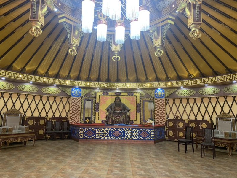 在伊力特馆长的带领下,我们分别参观了蒙古族传统文化展示厅和蒙古族文化实物展示厅。通过伊力特馆长与调研团队的交流,我们了解到,蒙古族传统文化展示厅是肃北县非遗文化旅游接待游客的第一站。展示厅中坐落着一座成吉思汗雕像。