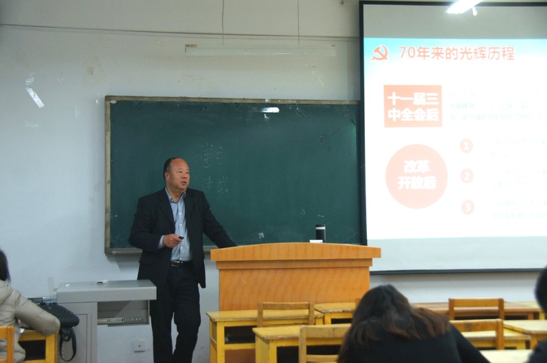 本次授课雷院长从沧桑巨变的七十年、七十年来的光辉历程、七十年来的伟大奇迹和七十年来的历史启示四个方面为大家讲述了中国共产党从成立到今天所取得的举世辉煌的成就。雷院长在讲课中谈到,中国70年巨变的根本原因,70年历史性变革的内在逻辑,就是坚持中国共产党的领导,要办好中国的事情关键在于坚持中国共产党的领导。实事求是是中国共产党思想路线的精髓,实事求是的思想路线一次又一次在我们党面临巨大危险和考验的过程中被反复确认和坚持,是我们党战胜一切艰难险阻的科学的思想武器。有了中国共产党的领导和正确的思想路线,还必须坚持走中国特色社会主义道路,才能让我们党和国家的事业不断焕发生机与活力。之后他向同学们介绍了中国共产党创始人和开国领袖毛泽东的历史功绩和党建理论,并且希望能通过此次授课引导大学生们深入学习中国伟人身上的历史使命感与责任感,珍惜当今幸福生活,为实现“中国梦”树立终身的坚定的信念。最后,雷院长总结了七十年来的历史启示:雄关漫道真如铁,而今迈步从头越,作为新时代的中国人,我们要从新中国七十年历史中汲取营养,汲取智慧,开启更为光辉的历程,创造更为伟大的奇迹。