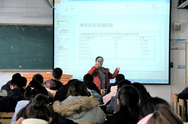 课程伊始,潘静老师先对酒店类企业在甘肃发展中存在的问题展开讲述。潘静老师针对酒店从业人员缺口大,学历低的问题,列举了一系列的数据。例如,80%的酒店服务人员存在学历低的现象,从业人员主要以初中、高中学历为主,高素质服务人员缺口大。潘静老师通过图文结合的数据,让同学们清晰地了解到甘肃酒店类的企业主要以小型或中型企业数量居多,大型酒店企业在甘肃分部较少。潘静老师通过对酒店类企业发展中出现的问题进行详细的分析,提出了一系列发展建议,如吸引外资,政府补贴,给予宽松的外部环境,加强对酒店服务人员的培训水平,提高服务意识等。最后,潘静老师通过酒店类企业的分析以小见大,提出了对甘肃旅游业发展前景的展望。潘静老师指出,甘肃旅游业要不断的深化对外开放,提高现代化治理水平才能有更好的发展。