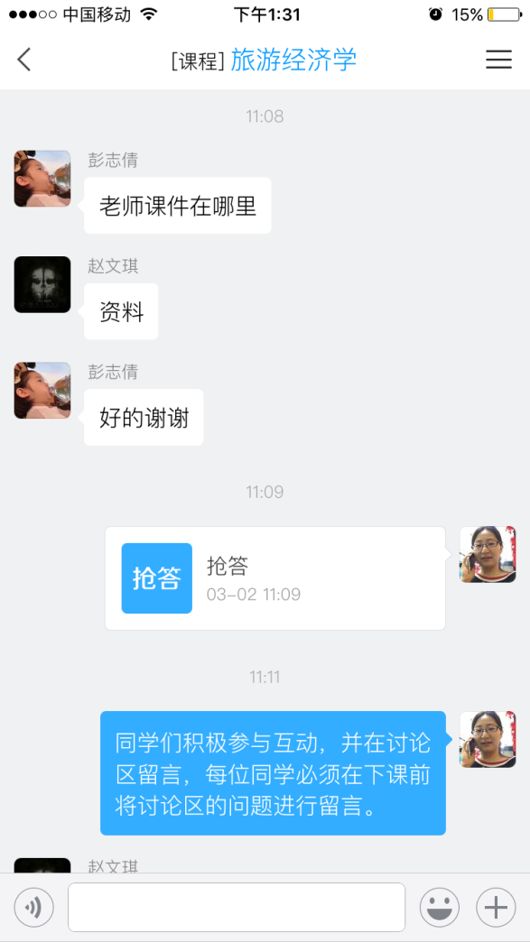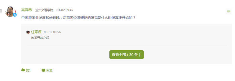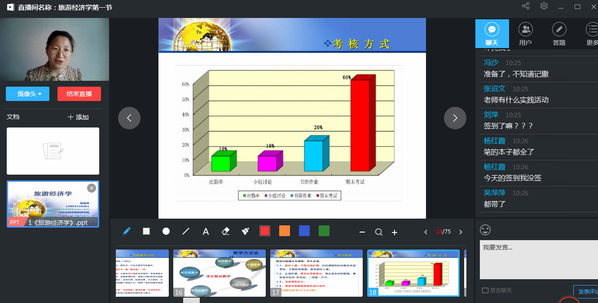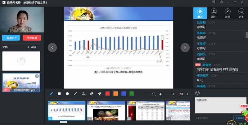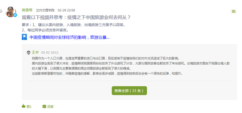 2.积极进行互动,确保学生时时在线。网上直播课不同于传统教学课堂,老师看不到网络另一端屏幕后同学们的听课状态,那怎样才能让学生保持对直播课的注意力?个人感觉就是要时时互动,把学生的注意力和目光集中到课堂上,尽可能设计一些有趣的互动话题,让学生参与讨论。比如,在旅游经济学课堂,我将疫情对旅游造成的影响的相关视频进行了上传,让学生现场观看,并就其中的问题进行讨论,并在讨论区留言,并要求每位学生必须参与讨论。