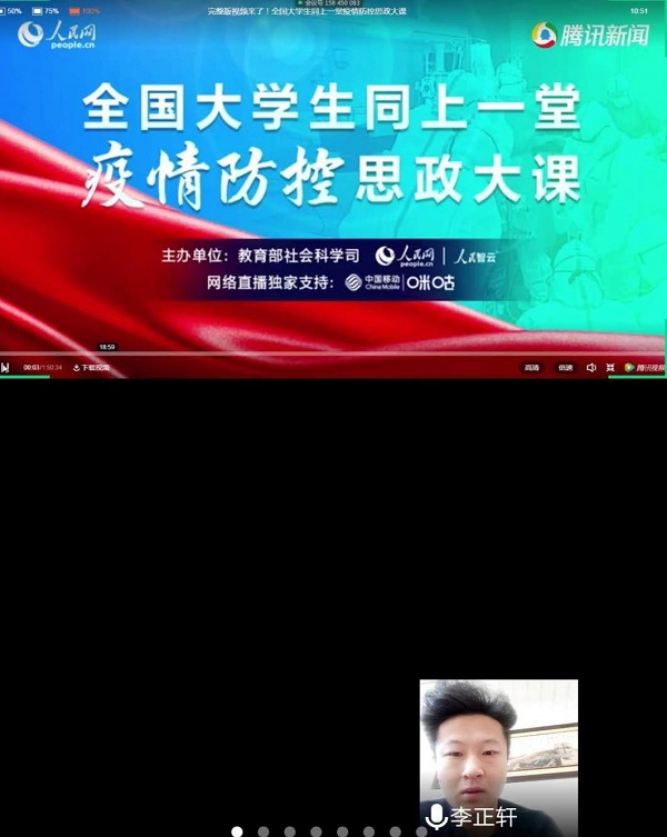 最后进行了全国思政大课堂学习后的感悟大讨论,学生党员同志在会上认真发言、积极讨论、相互学习。学生党员纷纷表示,将自觉发挥党员模范带头作用,用实际行动诠释一名共产党员的担当。通过微信群、QQ群等网络平台积极与其他同学联系,号召大家听从指挥,做好防护,不信谣、不传谣,不提前返校,按时参加线上教学活动,积极参与线上教学互动,认真完成老师布置的各项教学任务,为打赢疫情阻击战贡献力量。