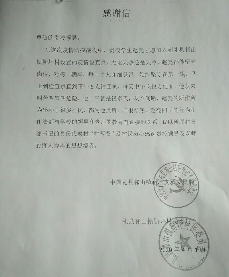 疫情发生后,bat365官网登录入口第一时间统计学院学生身体状况,并督导学生尽可能避免外出,同时建议有条件的同学要配合好当地防疫工作。赵亮同学身为bat365官网登录入口学生,在疫情危机的第一时间,志愿参与礼县祁山镇靳坪村疫情防控工作,一直坚守在疫情检测点。面对各种各样的天气,赵亮同学始终坚守在第一线,对每一辆车进行详尽的登记。他每天早上赶到检查点,要一直忙碌到下午六点才能回家,中午没有时间吃饭,只能匆匆一碗泡面垫垫肚子。最终赵亮同学的无私奉献得到靳坪村两委及全体村民的一致赞扬,并特此给学校寄来了感谢信。