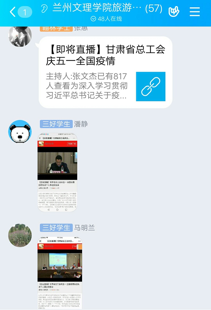 4月27日下午三时,bat365官网登录入口组织全体无课教师观看了甘肃省工会举办的甘肃全国疫情防控先进个人事迹报告会直播。老师们纷纷表示,要向劳模学习,真正做到“不忘初心、牢记使命”,忠诚履职,敬业担当,努力在平凡的岗位上做出不平凡的成绩。