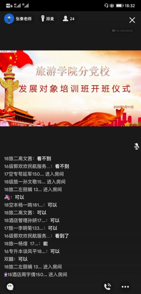 首先,由张秦老师为大家介绍了党课培训计划、相关纪律规定以及今后党课活动的安排。虽然是在线上上党课,但张秦老师希望大家仍然能够严格遵守培训纪律、不迟到、不旷课,端正入党态度,认真对待每一次的党课培训。接着,由谈风平同学代表全体党员发展对象发言,他结合当下疫情谈了谈自己的感受,并表示作为党员发展对象,要以身作则,进门勤洗手、出门戴口罩,在校期间,配合好老师和学校的工作,遵守学院和学校的规定。