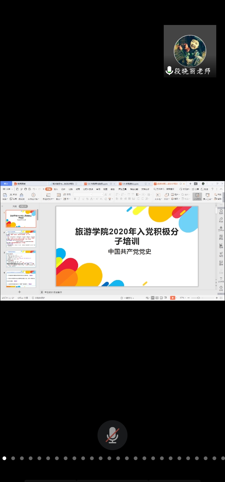 为增强党的凝聚力、吸引力和向心力,加深积极分子对中国共产党党史的理解,我院于2020年5月17日8:30在线上开展了入党积极分子党课培训——《中国共产党党史》。主讲人为我院第三党支部书记段晓丽老师,全体入党积极分子参加了本次党课培训。