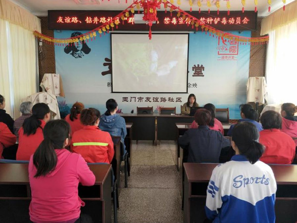 图为实践团队成员组织社区居民召开禁毒宣传禁种铲毒动员会,带动大家和我们一起齐心协力。中国青年网通讯员雷方圆供图