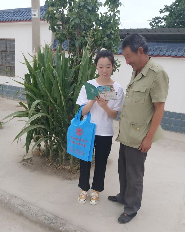 此图片为实践团队成员向村民介绍禁毒宣传的内容。(张合英供图)
