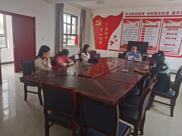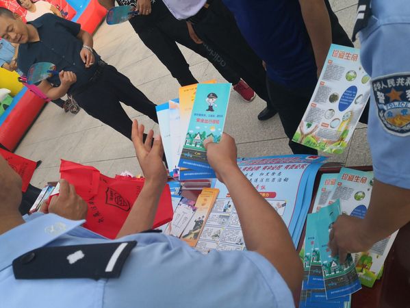此图为实践团队成员与派出所工作人员分发禁毒资料,向居民群众介绍毒品的种类,详细讲解吸毒、贩毒的危害性(张合英,供图)