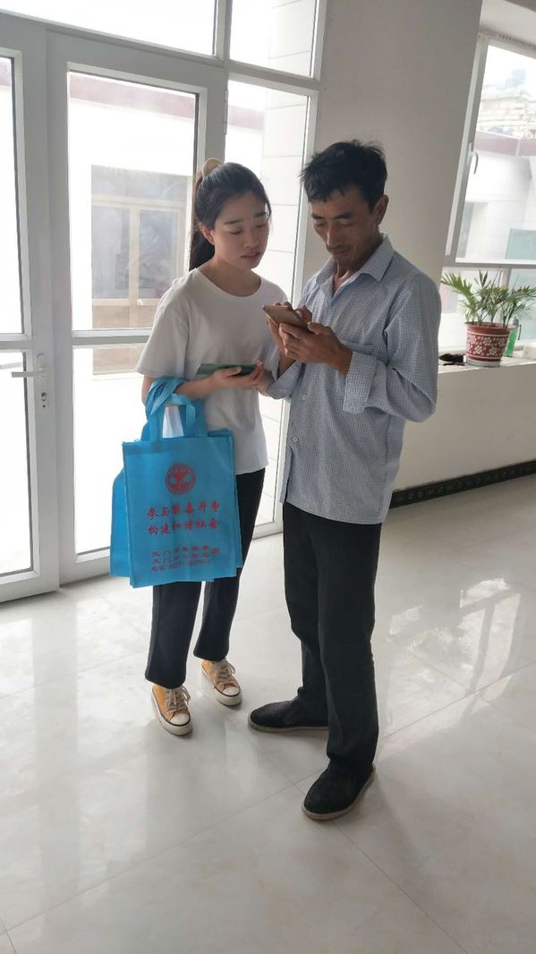 此图片为实践团队成员进家庭向老人宣传禁毒知识(张合英供图)