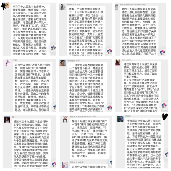 本次学习研讨会分三部分举行。首先张秦老师对十九届五中全重要讲话做了简单介绍,她提到:习近平总书记的重要讲话,高瞻远瞩、总揽全局,思想深邃、内涵丰富,鼓舞人心、催人奋进,为做好“十四五”时期各项工作、全面建设社会主义现代化国家指明了前进方向,提供了根本遵循。并且希望党支部成员可以认真完成学习强国的任务,主动学习十九届五中全会的精神,不断提高自己的党性修养。随后,党支部组织全体成员通过线上聊天的形式,分享了关于十九届五中全会的学习感悟。支部成员纷纷表示,作为一名大学生党员,全会的精神使他们印象深刻,受到了极大的触动。通过学习十九届五中全会精神,大家都坚信我国的经济发展水平一定会呈现出一个稳步上升的态势,在国际社会中的地位也将会不断上升,综合国力更会逐步加强。并且希望我们每一位同志都能为早日实现社会主义现代化及民族复兴贡献自己的力量。最后,张秦老师对本次会议做出了总结。大家对十九届五中全会精神都有了自己的认识与见解,希望支部党员牢记党员义务,积极承担社会责任,在这个特殊的时期,决胜的时刻,尽全力奉献出自己的一份力量。