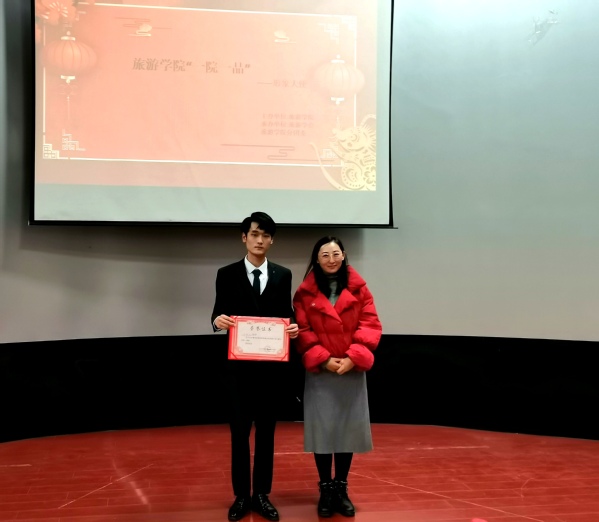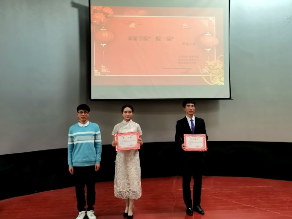 大会初始,主持人向我们介绍了学院举办本次活动的意图及对同学们的期望,学院希望此次大赛可以更好的展现我院学生风采,展现出我们在学习之外不同的精神风貌。接下来,各位参赛选手向我们逐一进行了自我介绍及才艺表演,选手们精心的准备赢得了现场接连不断的掌声。他们不仅表演精彩,而且才艺展示类型丰富多彩,有舞蹈、歌曲,还有乐器独奏、诗歌朗诵、模拟主持,令现场观众应接不暇。在精彩的表演过程中,各位评委依据各位选手的现场表现等各个方面进行了打分,评选出了表现突出同学。在统计分数的同时,我院指导老师马婷婷进行了点评讲话,首先,她对本次活动同学们的准备认真,才艺丰富提出了表扬,其次向同学们提出了需要改进的地方,一是对舞台形象的准备不够全面,个别选手未注意舞台形象的重要性,二是对才艺展示主题的把握不够明确,才艺不仅要体现出我们的个人形象,也要体现出我们的心灵形象,三是舞台经验不够丰富,希望同学们能多多参加活动,提升舞台经验。比赛最后,由马婷婷老师、王强同学分别为一等奖获得者王凯元,二等奖获得者刘栩彤,柳凯文同学颁奖,并进行合影留念,大赛至此结束。