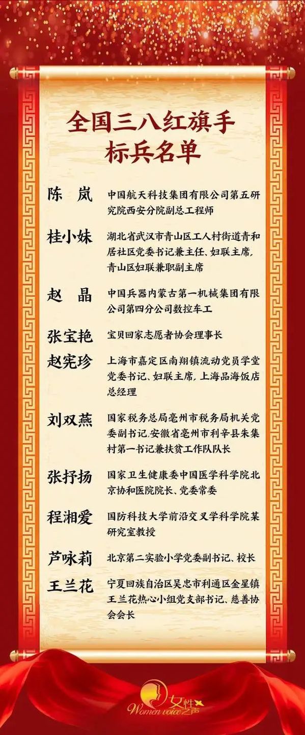为表彰先进,树立榜样,团结动员广大妇女积极投身全面建设社会主义现代化国家新征程,近日,全国妇联公布了2020年度全国三八红旗手标兵、全国三八红旗手、全国三八红旗集体名单,授予陈岚等10人全国三八红旗手标兵、陈芳等300人全国三八红旗手、北京佑安医院呼吸与感染疾病科等199个单位全国三八红旗集体称号。