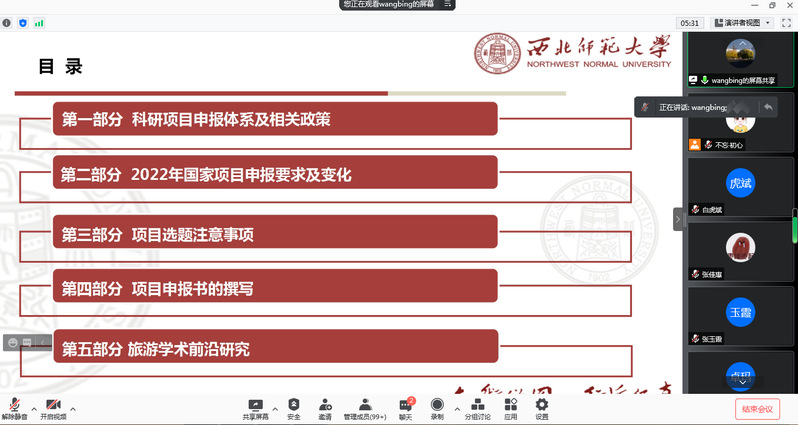 梁旺兵教授围绕“2022年项目申报政策解读及申报要点——兼论旅游学术前沿研究”主题,从“科研项目申报体系及相关政策、2022年国家项目申报要求及变化、项目选题注意事项、项目申报书的撰写、旅游学术前沿研究”共5个方面与学院师生进行了交流。重点针对2022年各类项目的申报进行了指点和答疑。针对学院教师提出的科研难题、申报项目的困境、研究方向的转型、学术研究热点等问题给予了耐心解答和倾情传授。针对学生提出的跨专业考研、就业意向、毕业论文撰写等问题也一一给予了详细解答。讲座现场气氛热烈。