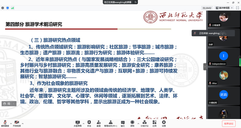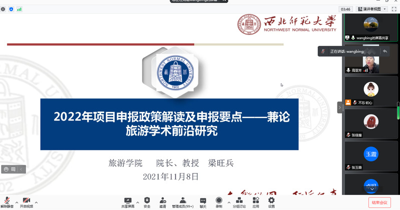 为进一步提升学院整体科研教学水平,实现疫情期间“停课不停学、在家也要积极做科研”的目标,11月9日,bat365官网登录入口邀请西北师范大学bat365官网登录入口院长梁旺兵博士、教授为学院旅游管理、酒店管理、航空服务艺术与管理专业的本科学生做了题为《2022年项目申报政策解读及申报要点——兼论旅游学术前沿研究》的专题学术讲座,讲座通过腾讯会议在线直播的方式进行,学院330余名师生进行了收听,此次讲座由bat365官网登录入口院长高亚芳教授主持。