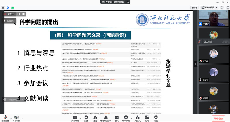 王耀斌教授围绕“科学问题的提出;科学问题的表达——论文;科学问题的表达——项目”这三个方面进行了讲解。首先,解释了科学问题的重要性、何为科学问题、科学问题的分类、问题意识和科学问题误解;其次,讲解了科学问题的表达——论文,它的贡献应如何更好地体现,书写论文“贡献”的具体方法,主要理论的梳理;最后,详细指导了大家如何撰写项目申报书,并将自己的基金项目书的申报进行了分析。